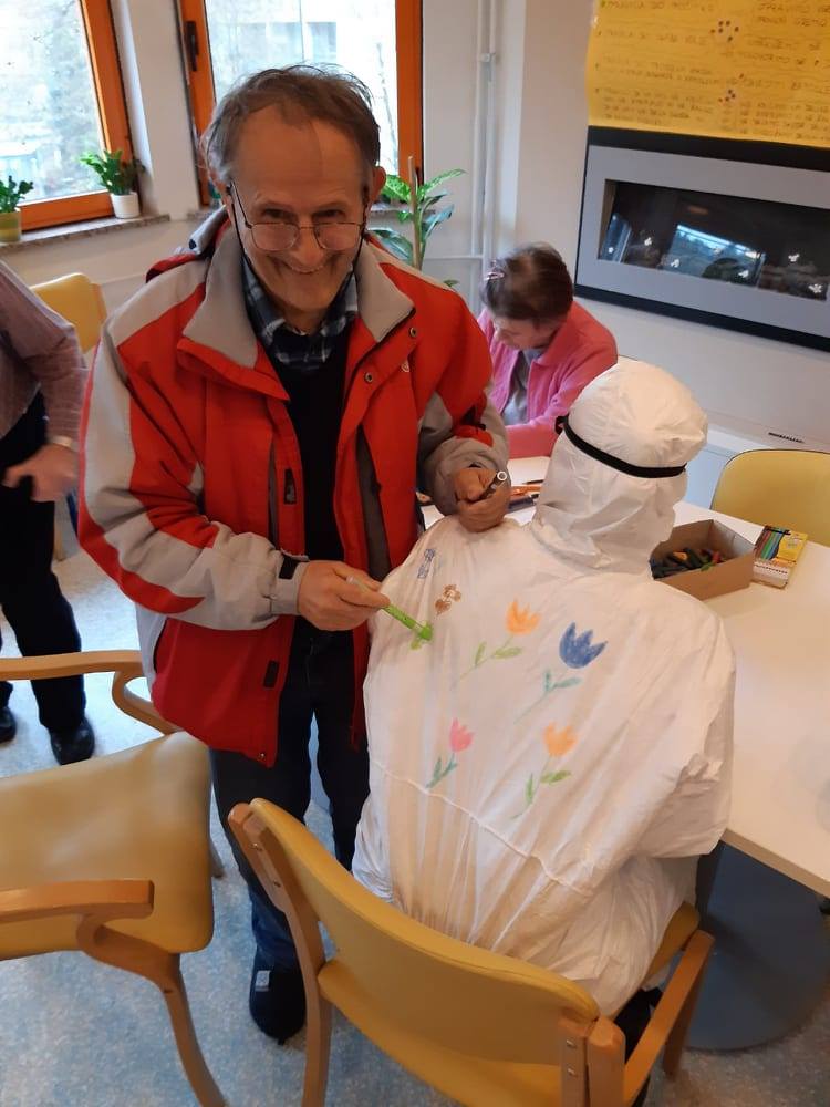 Četudi življenje poteka v rdeči coni malenkost drugače kot sicer nam dobre volje res ne zmanjka. In briljantnih domislic tudi ne. Tako da, res velja rek, da sami barvamo svoje življenje. In če so zaščitne obleke zaposlenih dolgočasno bele, le zakaj jih ne bi spremenili.