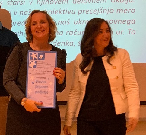 V petek 30.11.2018 je naš zavod prejel polni certifikat družini prijazno podjetje. Priznanje smo prejeli na podlagi realizacije vseh 15 ukrepov, ki vsem skupaj pomagajo pri iskanju ravnovesja med poklicem in družino. Še eno priznanje na naši skupni uspešni poti.