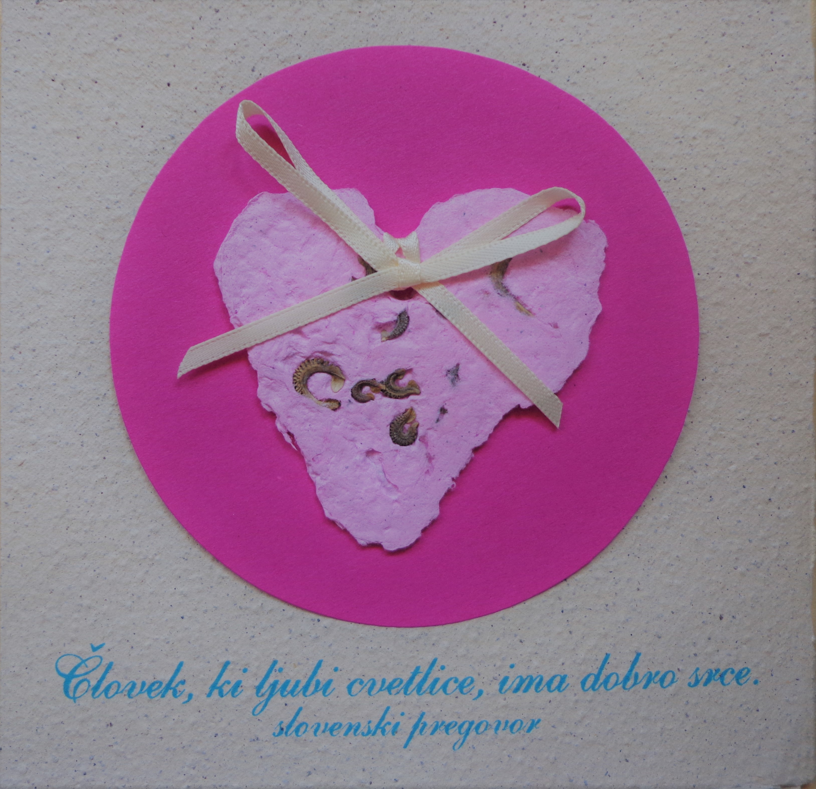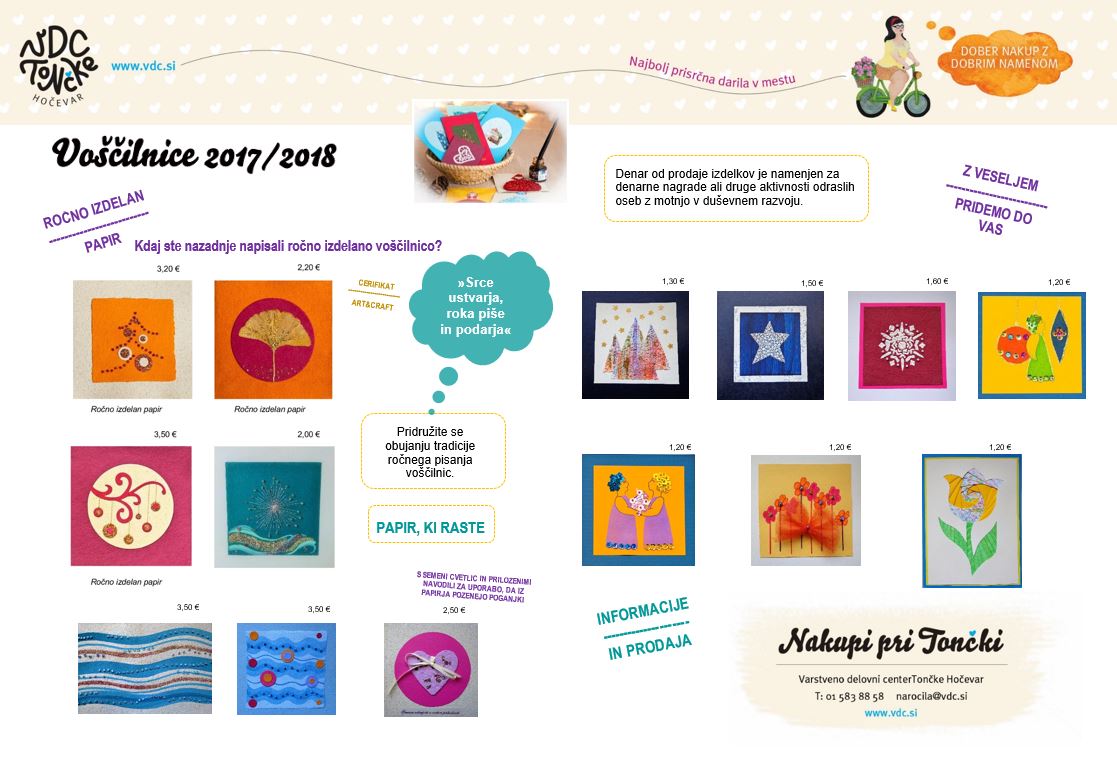 Voščilnica iz ročno izdelanega papirja, s primešanimi semeni in navodili za uporabo. Semena v papirju v ustreznih pogojih (voda, svetloba, zemlja) pričnejo kaliti in rasti. Izdelek iz enkrat že recikliranega papirja ponovno dobi novo vrednost: namesto, da ga zavržemo, ga posadimo in iz njega zrastejo poganjki. Voščilnici je priložena kuverta. Cena vključuje DDV.